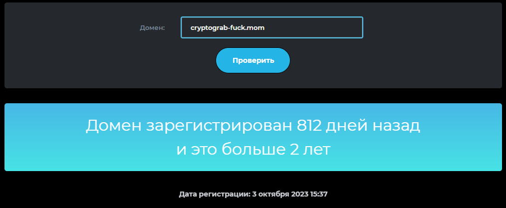 Данные о компании, контакты, юридическая информация и тому подобное скрыто. Мы самостоятельно узнали, что сайту Cryptograb Fuck Mom около двух лет, но учитывая странный домен, его могли использовать и другие организации.