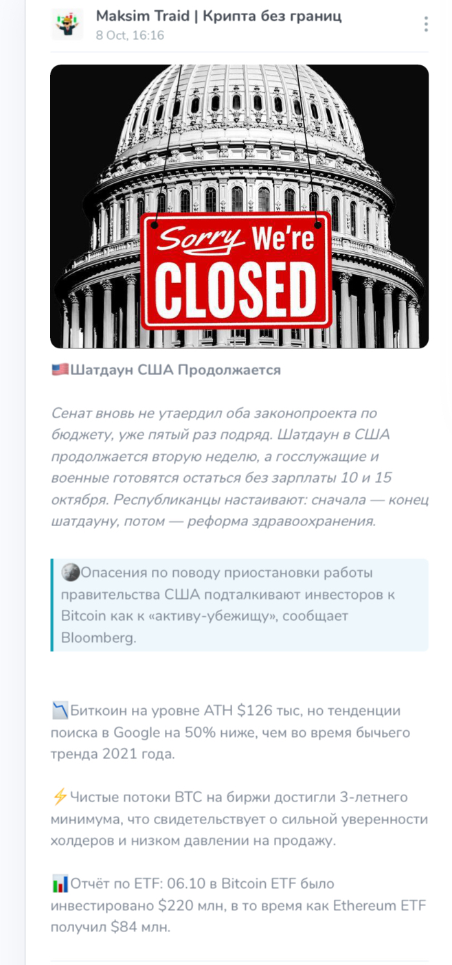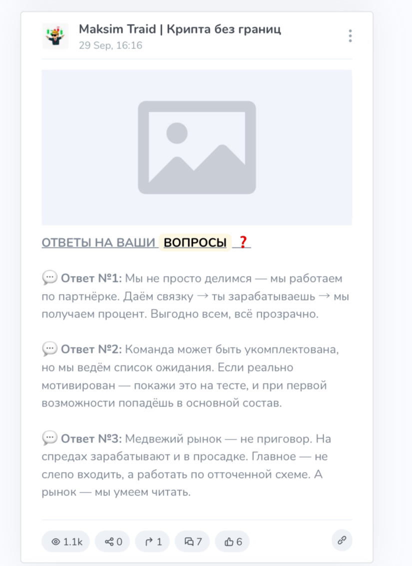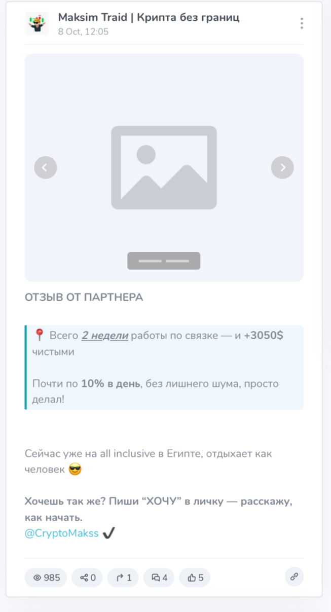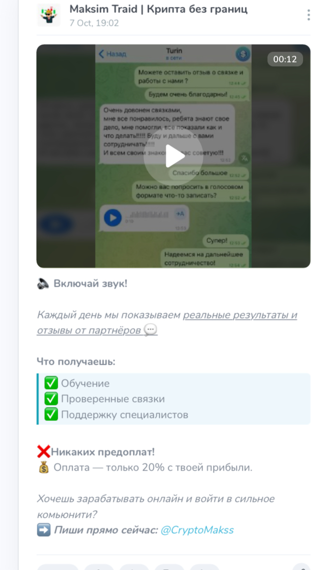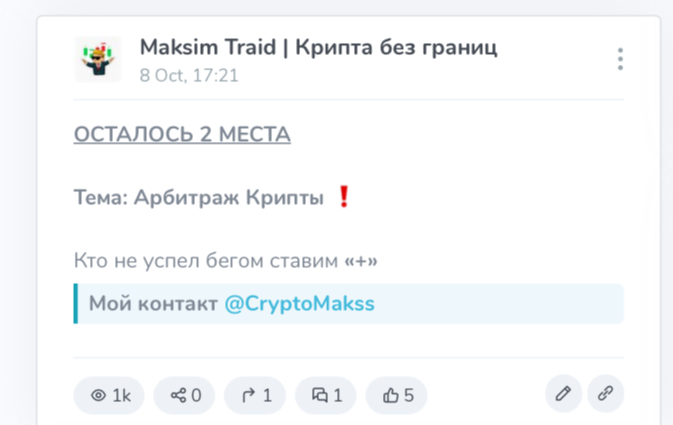 В канале можно найти как новостные записи о глобальных событиях в политике и экономике, так и записи на криптовалютную тематику. В основном контент — призывы к сотрудничеству и набор в команду по арбитражу трафика. Такие посты формируются в виде ограниченного предложения, создавая искусственный спрос на услугу.Услуги «Maksim Traid Крипта без границ»