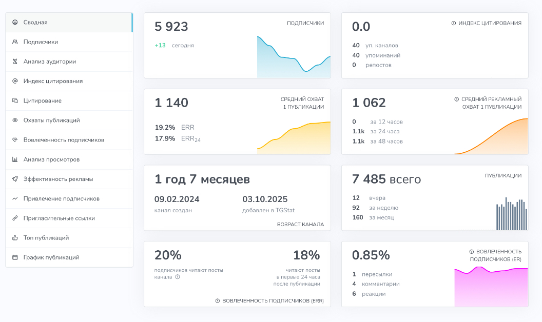 Его канал — единственный источник заработка и способ продвижения. На него подписано ~ 6 000 человек. Мы проверили метрики по проекту через TgStat. Выяснилось, что средний охват одного поста — 1 140, что равно примерно 20% от всего числа аудитории. Это может показаться подозрительным. Сам канал существует 1 год и 7 месяцев.