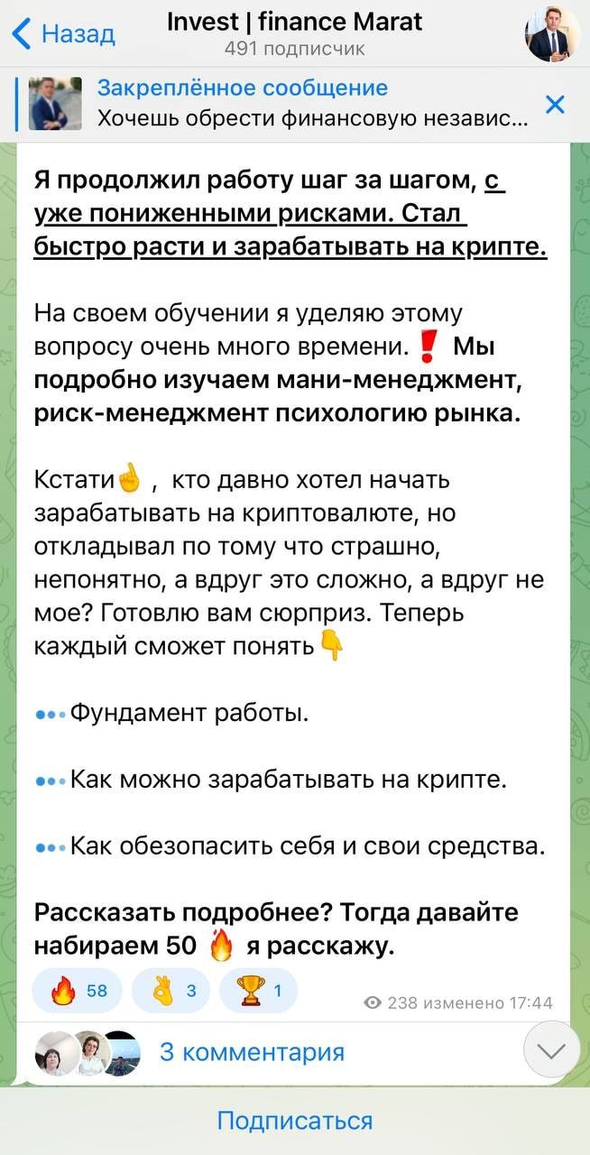 Марат Сайгафаров является одним из множества Телеграм-блогеров, который на самом деле не является трейдером. В его канале много мотивирующих постов и мало конкретики об условиях обучения