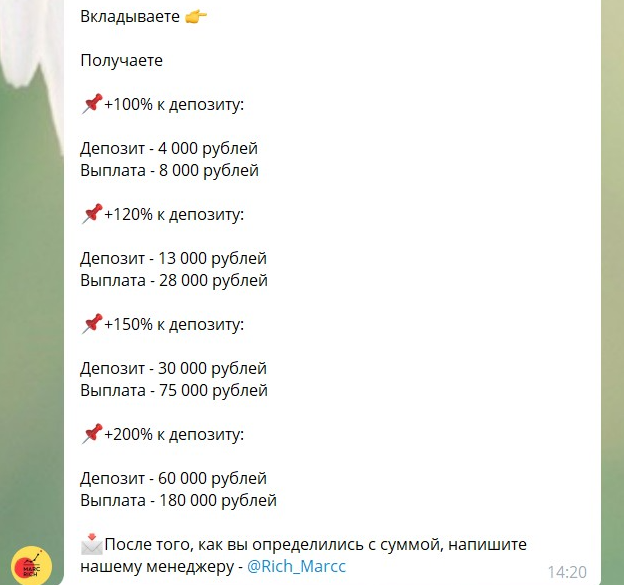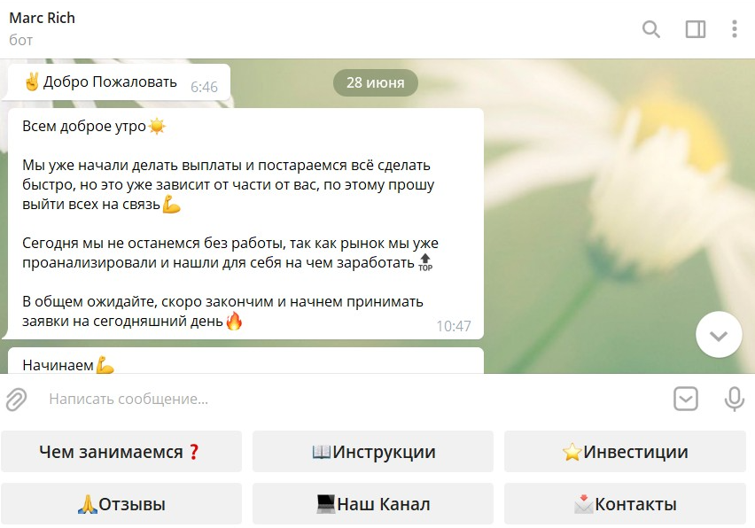 Бот Marc Rich использовался для приветствия, у него можно было получить инструкции, ссылки на каналы или контакты администраторов. Также через него проходила продажа услуг, информацию о чем можно найти в открытых источниках, так как она сохранилась и в 2025 году.Например, клиентам предлагали воспользоваться раскруткой счета, чтобы получить прибыль без каких-либо рисков или траты времени. Достаточно было вложить от ₽4,000 и дождаться окончания торговой сессии, выплата якобы сразу приходила на счет подписчика.