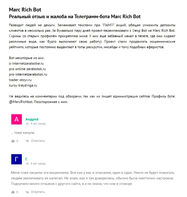 В интернете сохранились отзывы о работе бота Marc Rich, в них пользователи утверждают, что их обманули. Например, в одной из жалоб рассказывается о схеме мошенничества, так как клиентов заманивают в инвестиционный проект, но не дают вывести прибыль.