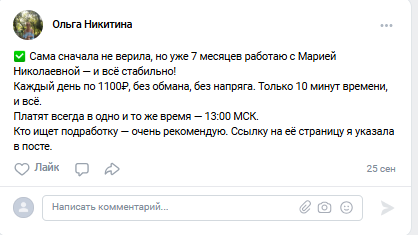 Существуют фейковые положительные отзывы о деятельности Марии Николаевны, которые размещаются в социальных сетях, где они повторяют один и тот же текст о стабильных выплатах за 7 месяцев без деталей опыта.