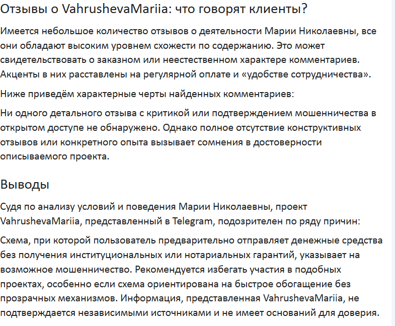 В ходе анализа деятельности VahrushevaMariia было установлено, что схема маскируется под простую подработку в онлайн-рекламе и обманывает людей. Мы выделили причины, по которым участие в проекте является опасным: