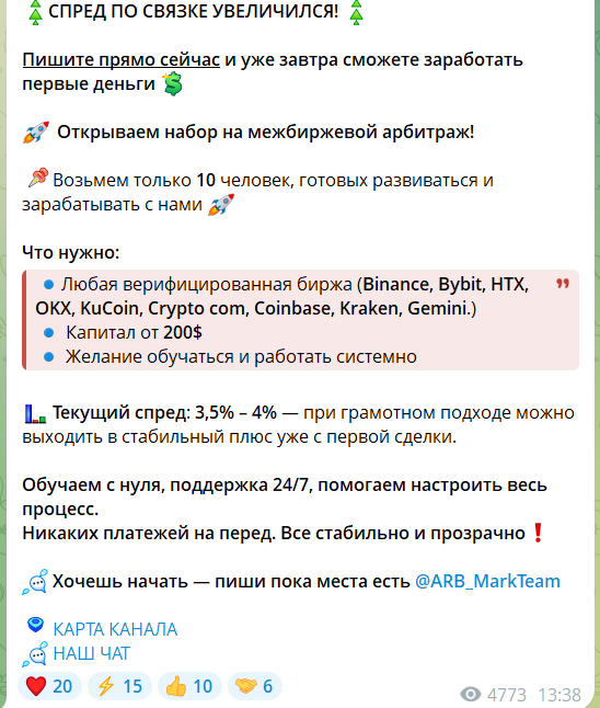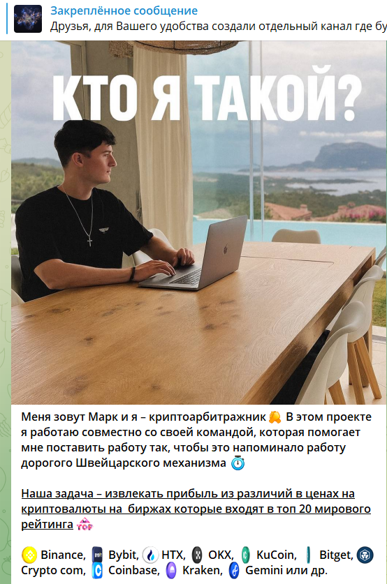 В телеграмм-каналае есть привественный пост, в котором Mark Team не раскрывает подробно свой путь в трейдинге и инвестициях, делая акцент на объяснении собственной системы и упоминании методов заработка. Так, Марк утверждает, что остоит в некой команде, использует специальный софт, чтобы вычислять спреды и зарабатывать на разнице в ценах.