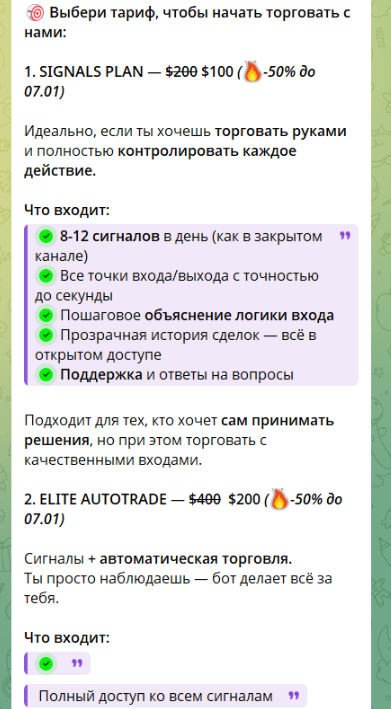 Тем не менее в интернете сохранились скриншоты некоторых постов в Крипто Инсайдер Стим. Отсюда можно узнать. например, об услугах трейдеров. Пользователь может приобрести доступ к тарифу за 100 или 200 долларов. Основное содержание обоих вариантов – сигналы и объяснение их логики. Разница лишь в количестве сделок и времени взаимодействия с кураторами.