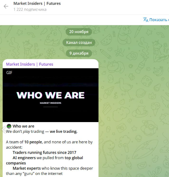 Market Insiders Фьючерсы не выглядит как сообщество в Telegram, которому можно доверить свой капитал. Кроме того, создатели требуют за свои услуги немалые деньги, но в их эффективности есть сомнения из-за следующих фактов:
