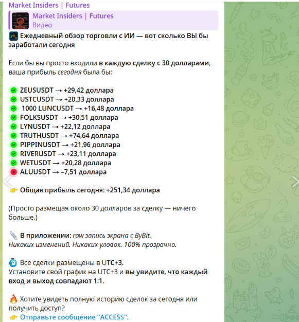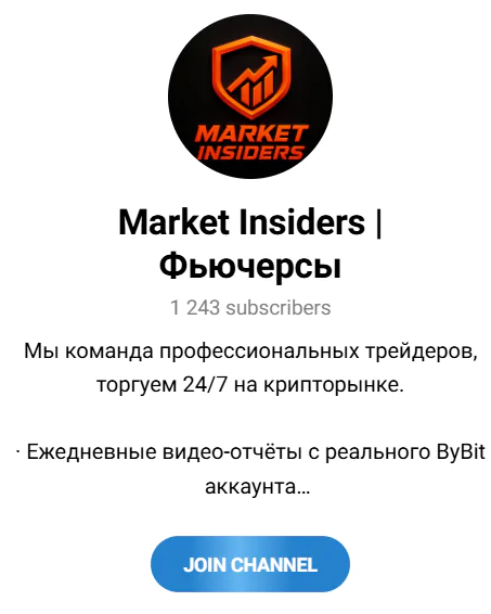 Market Insiders Фьючерсы – это канал в Telegram, который якобы ведут профессиональные трейдеры. Пользователям обещают регулярные отчеты о торговле на криптобирже Bybit, а также другой полезный контент. Мы сомневаемся в качестве материалов из-за отсутствия информации в интернете и малых сроков работы группы. Поэтому далее постараемся более подробно разобраться в работе сообщества.