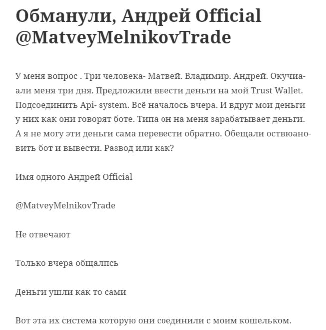 Это странный поход, который может оттолкнуть потенциальных клиентов. Плюс, из-за отсутствия различных деталей, проверить легальность работы блогера невозможно. Судя по единственной статье в сети с упоминанием имени трейдера, работает он не с порядочными намерениями.В разоблачении рассказывается, что три мужчины – Матвей М, Владимир и Андрей Official настойчиво предлагают свои услуги на просторах интернета. Они якобы помогают перевести деньги на нужный счет или кошелек.