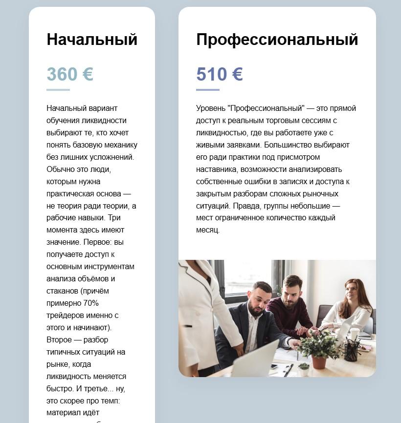 Обучение платное. Есть два тарифа – «Начальный» за 360 долларов и «Профессиональный» за 510 долларов. Программа курса не раскрыта. Сведений о формате занятий, длительности обучения, обратной связи кураторов нет.