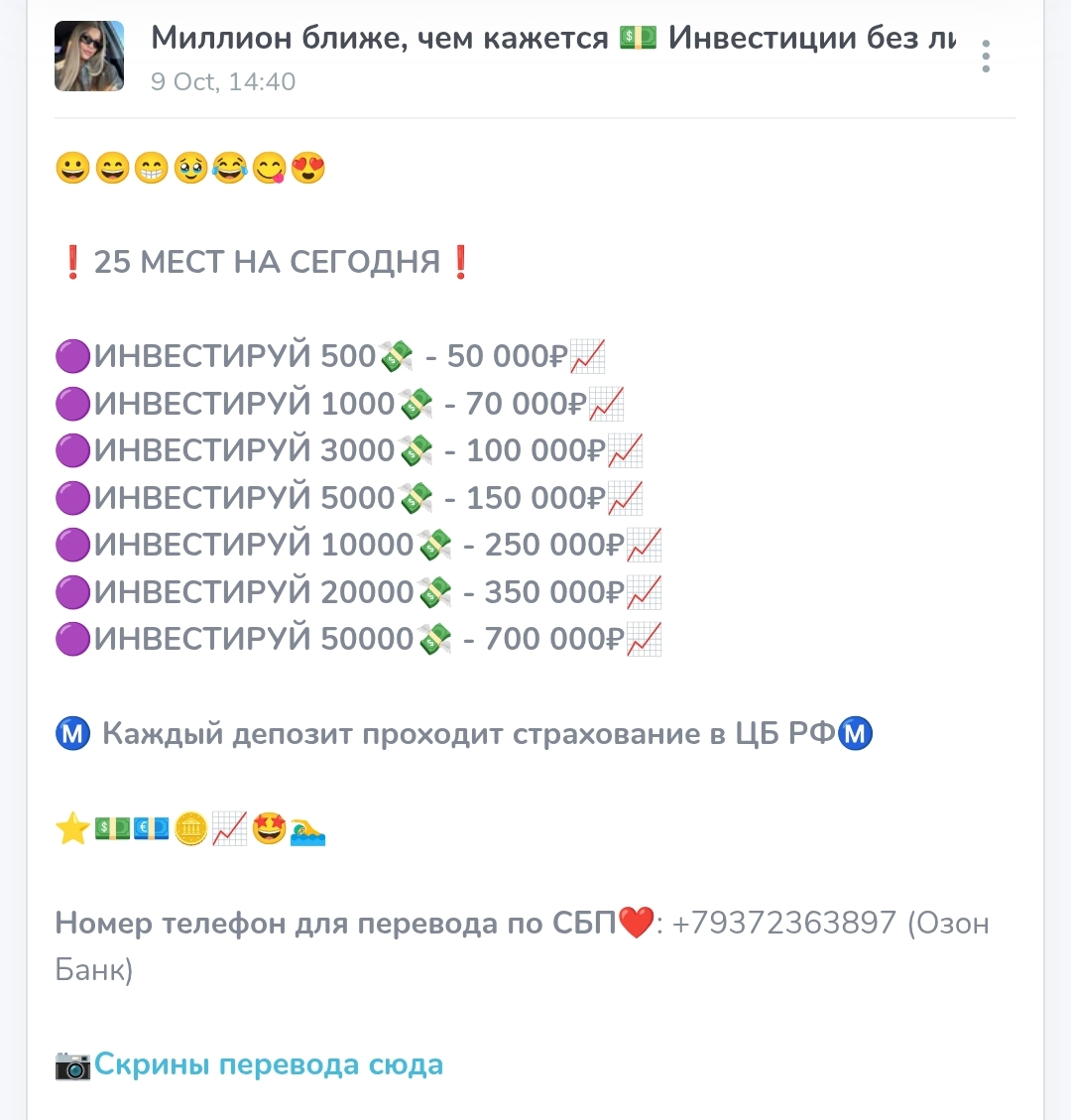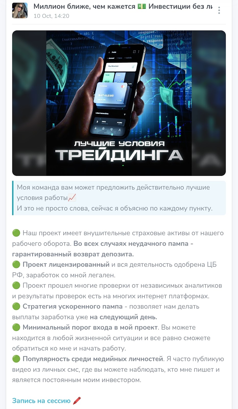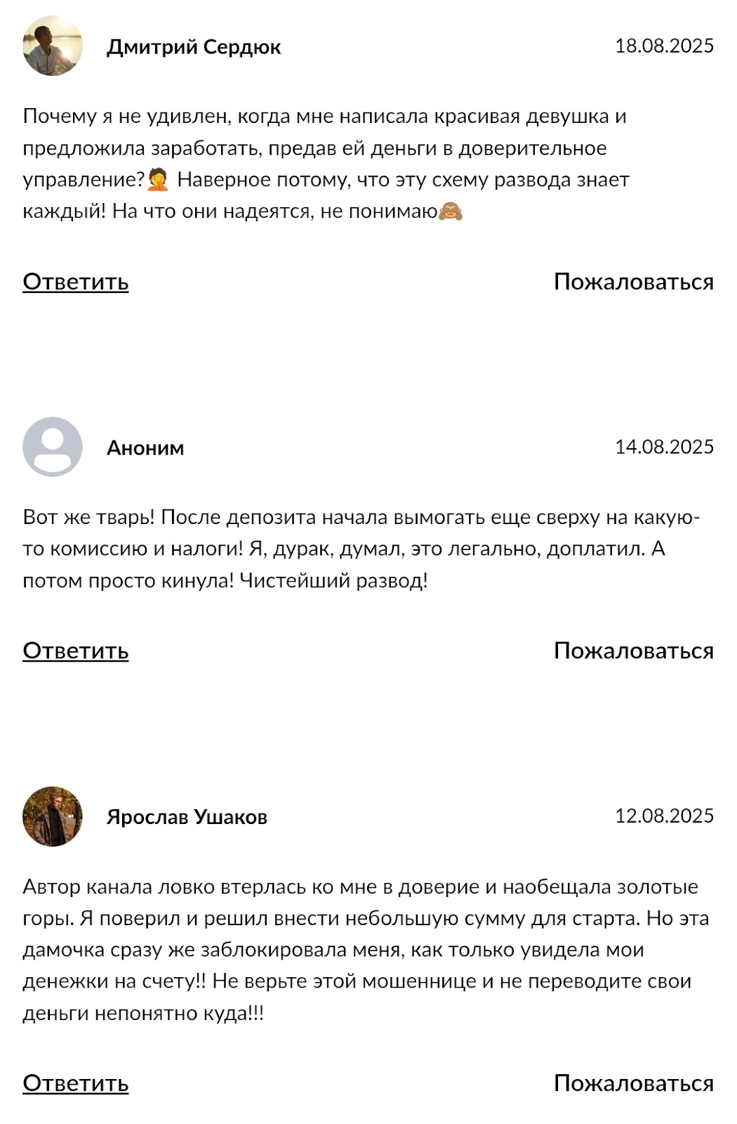 На самом деле, эта схема называется разгон депозита и используется многими аферистами для развода начинающих инвесторов. Средства клиентов просто присваиваются злоумышленниками. В сети есть сведения, что ранее Lisaksdadkas уже была уличена в мошенничестве. Она вела канал Лёгкий Путь к Миллиону Стабильные Инвестиции с аналогичным содержанием. После многочисленных жалоб клиентов, проект был закрыт, а точнее переехал на новую площадку.Самые доверчивые клиенты Елизаветы теряют не только первоначальную сумму. Трейдерша сообщает инвестору об успешно проведенной операции и готовности выплатить обещанный доход. Но сначала пользователь должен перечислить 10% заработка за страховые услуги. После появляются требования оплатить налоги, комиссионные и другие выдуманные счета.