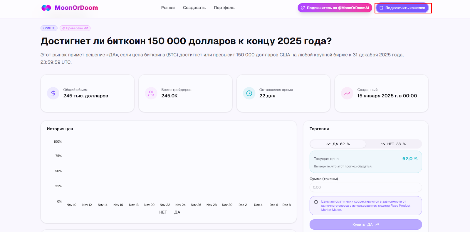 Чтобы работать с кошельком нужно подключить через WEB3 свой MetaMask кошелек, однако MoonOrDoom работает неофициально. На территории России у команды нет лицензий / регуляции, а сама деятельность является незаконной. Фактически аферисты хайпят на теме с AI прогнозами. Вдобавок существует риск потери средств после перевода их из кошелька на страницу.