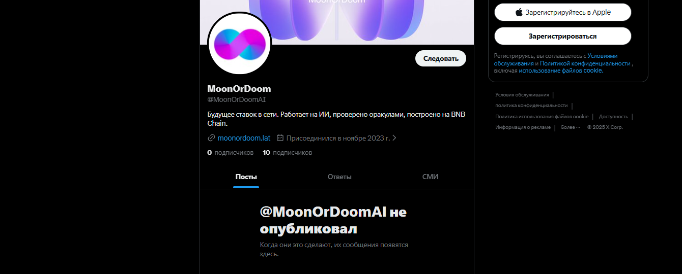 MoonOrDoomAI по словам разработчиков работает уже долгое время и собрал большие торговые объемы в 2.4 миллиона долларов. При этом официально домен был зарегистрирован менее 2 месяцев назад, а у компании вообще нет проверенных партнеров, из-за чего без реальных подтверждений вся эта статистика является обычным текстом. Вдобавок владельцы скрывают свою личность, а среди социальных сетей команда ведет лишь один канал в X, где нет постов и аудитория составляет всего 10 подписчиков.