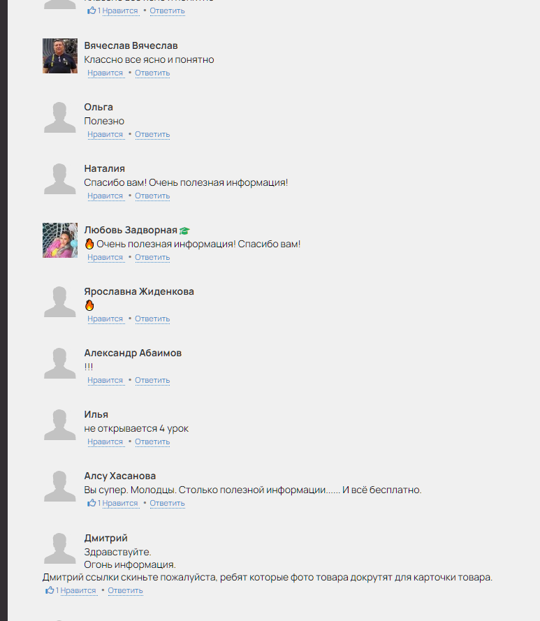 Комментарии пользователей не закрыты, значит наставник не боится негатива и готов конструктивно обсуждать все проблемы, связанные с обучением, качеством материалов, программой и другими вопросами.