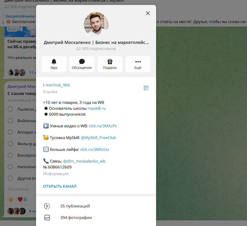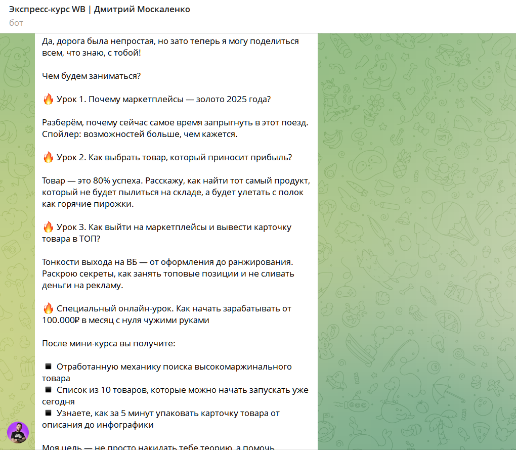 Автор проекта ведет несколько ТГ каналов, есть также бот школы «Экспресс-курс WB Дмитрий Москаленко» с которым удобно проходить первое бесплатное обучение, задавать вопросы наставнику.