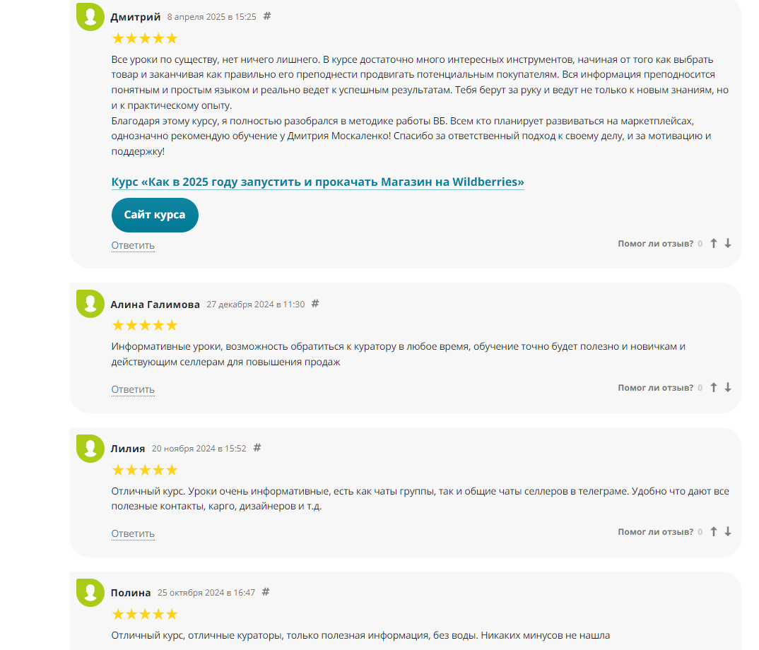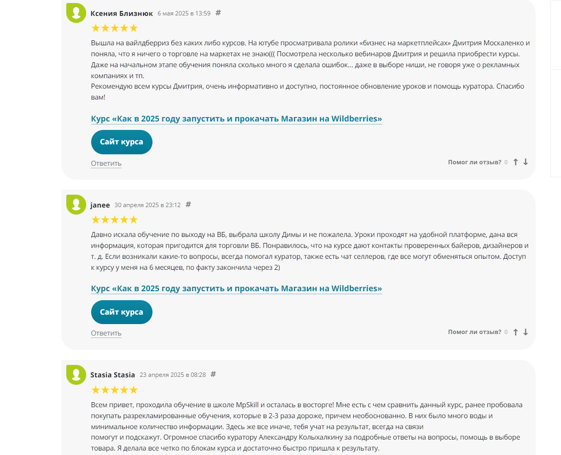 Надо отметить, что про этот курс обучение больше положительных отзывов. Людям действительно помогли тренинги, они увеличили продажи на маркетплейсе после обучения.