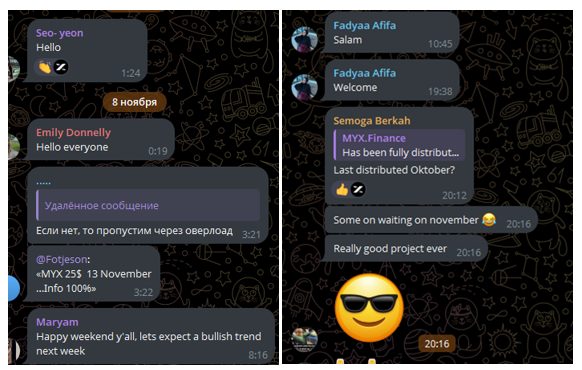 В официальной группе Телеграм MYX Finance особых обсуждений нет. Активность низкая, особого взаимодействия разработчиков с пользователями нет.