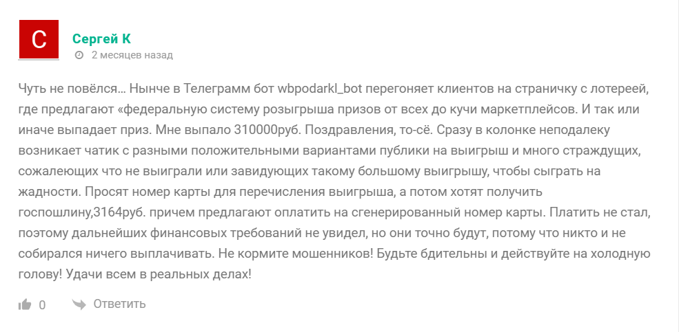 В сети отзывов о проекте почти нет, но по аналогичным схемам откликов хватает — и, как правило, они далеко не положительные. Пользователи отмечают типичные признаки мошеннических розыгрышей: обещания крупных выигрышей, просьбы оплатить госпошлину перед переводом приза и активное давление через фейковые чаты с радующимися победителями. Все это на практике сводится к выманиванию денег без каких-либо реальных выплат.