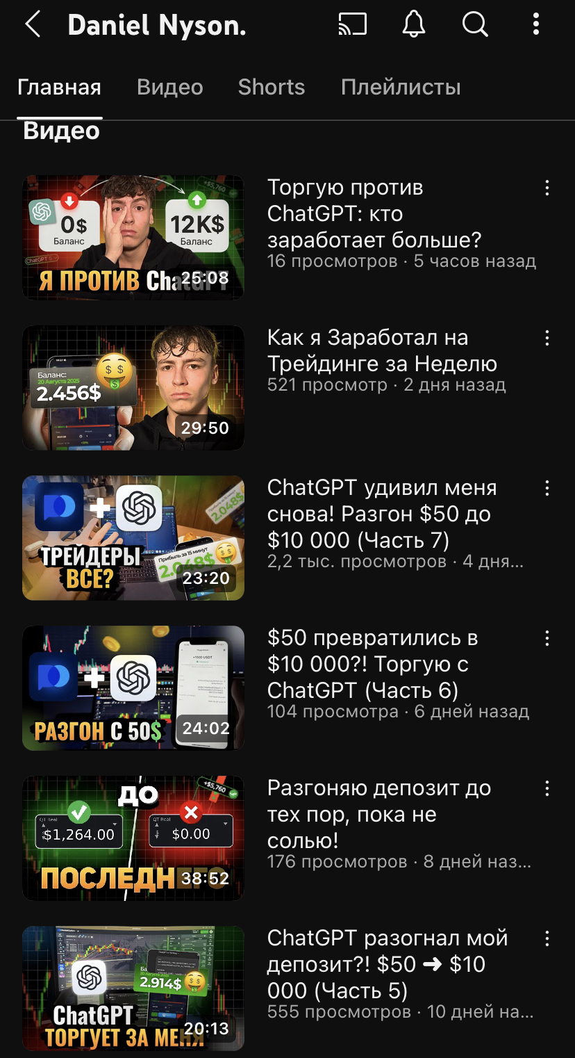 Проектом задействован не только не Телеграм, но и YouTube с каналом Nyson dd. Основную массу контента составляют ролики, в которых автор рассказывает о своем опыте торговли с нейросетью.