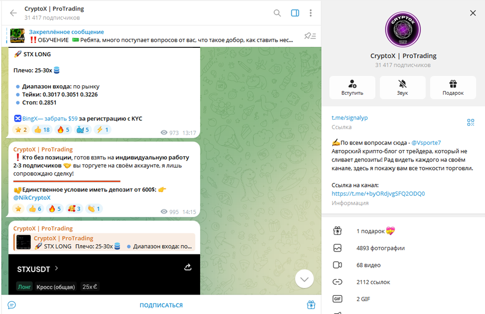 Также создатели ТГК не стесняются зарабатывать на реферальных программах. Практически каждая торговая рекомендация сопровождается приглашением зарегистрироваться на реферальной бирже и получить щедрый бонус.