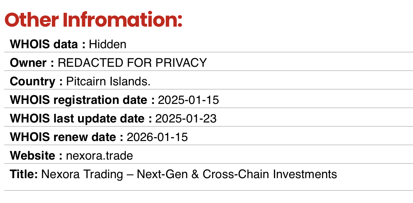 Nexora — типичный пример инвестиционной ловушки. Проект демонстрирует многочисленные признаки скама, в котором громкие заявления о гарантированной прибыли ничем не подтверждены. Даже если вам удастся вывести крошечную сумму на старте, это лишь приманка, чтобы вы вложили больше. Nexora предлагает лишь иллюзию богатства, за которую вы рискуете заплатить вполне реальные деньги.