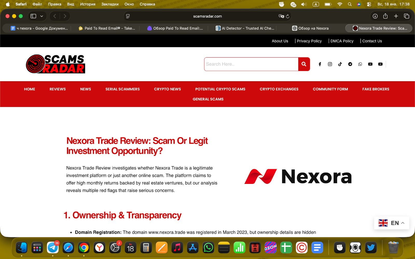 В сети появляются негативные обзоры и предупреждения о потенциальных рисках, связанных с Nexora. На разных обзорных площадках сервис не раз разбирали во всех деталях — и выводы неутешительные.Проект считают крайне рискованным, а то и вовсе ловушкой для инвесторов. Главные тревожные звоночки: нет никакой лицензии, непонятно, как именно работают их схемы, зато щедро раздаются обещания легких денег — без доказательств, что это реально работает.