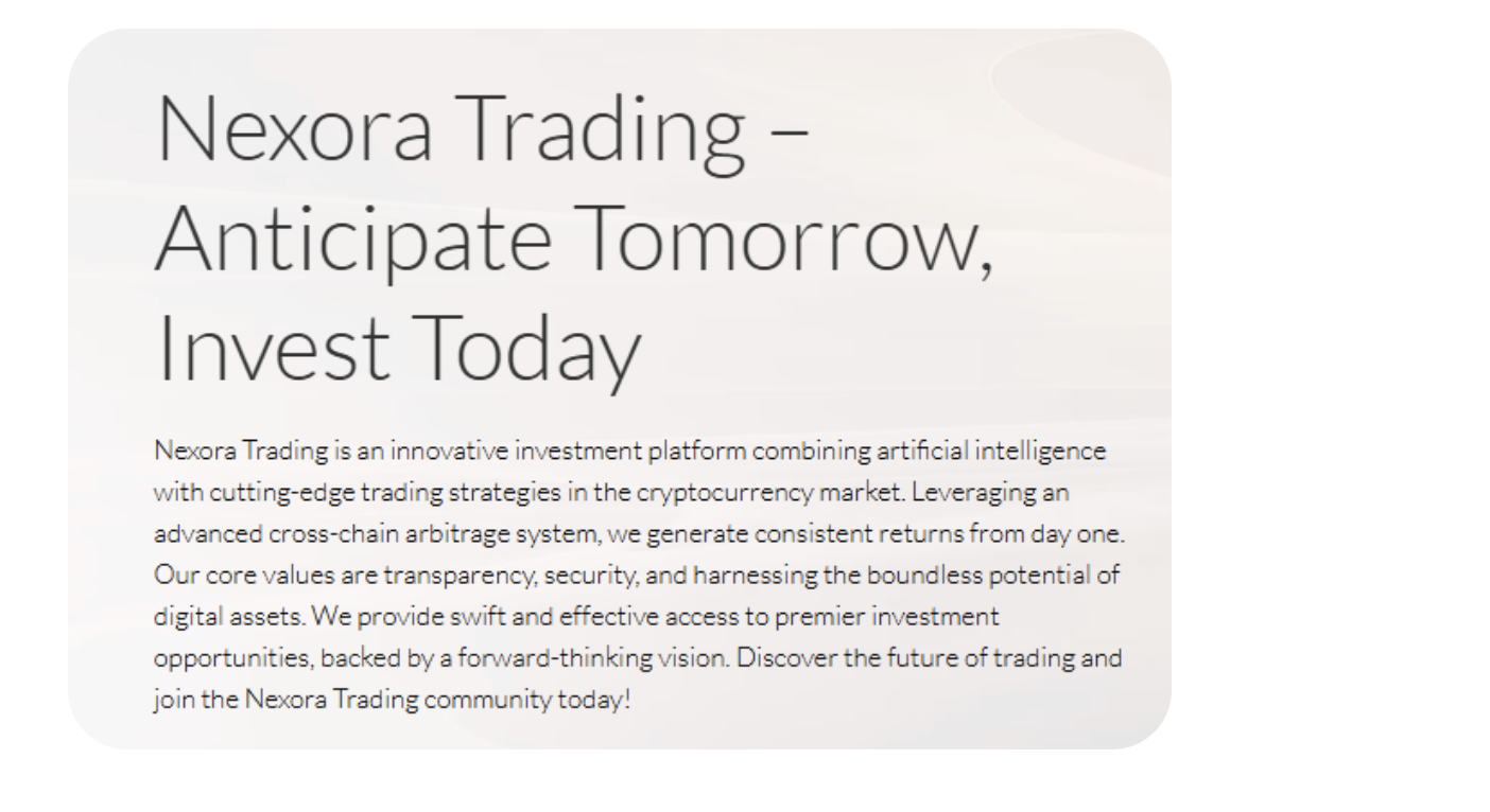 Единственный найденный нами источник проекта в интернете — сайт nexoraltd.com. Он выполнен сдержанно и стандартно, обилием информации не отличается. Выглядит он шаблонно, практически безлико: на его страницах много общих фраз про надежность, технологии и опыт команды, но крайне мало конкретики. Кто именно стоит за проектом, какие трейдеры управляют средствами, где зарегистрирована компания — все это либо подано вскользь, либо вообще не раскрыто.