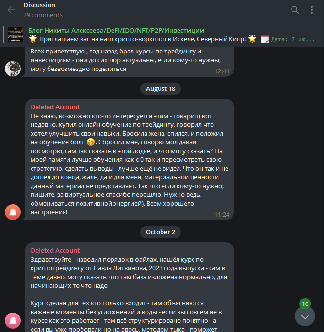 На момент исследования канала neki4 life в ТГ последний пост выходил 6 июня 2024 года. За полтора года он собрал 26 комментариев, но все они — спам с рекламой сторонних сомнительных кейсов.Что касается контента в блоге Никиты Алексеева, весь он сводился к продаже онлайн-курсов по финансам. При этом лицензия на образовательную деятельность не выдавалась. И какие-либо другие официальные документы тоже отсутствуют.