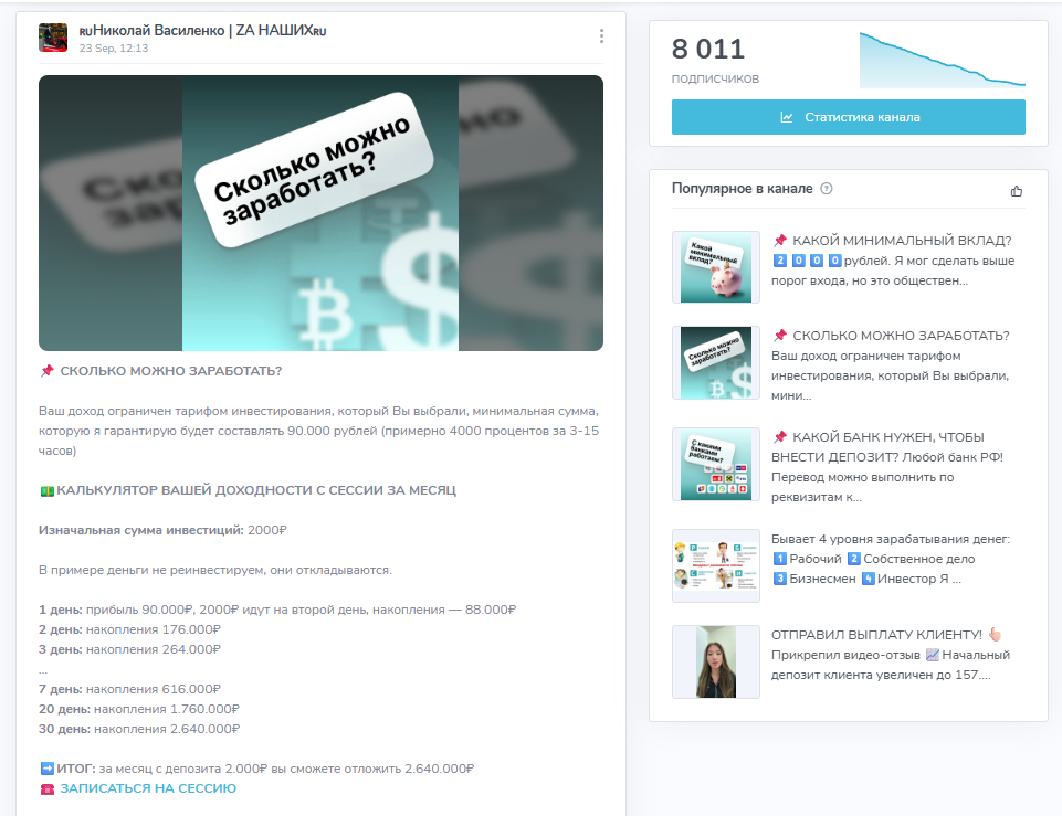 - калькуляция в канале подсказывает, что за месяц всего с 2000 можно получить прибыли на сумму 2,6 млн.