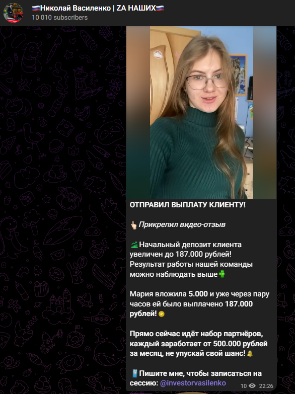 Проект За наших — очередной развод от Николая Василенко, которому принадлежит несколько Телеграмм каналов. Схема разгона депозита ничем не отличается от коллег по цеху, например, Анна Гайдук или Юрия Красова.