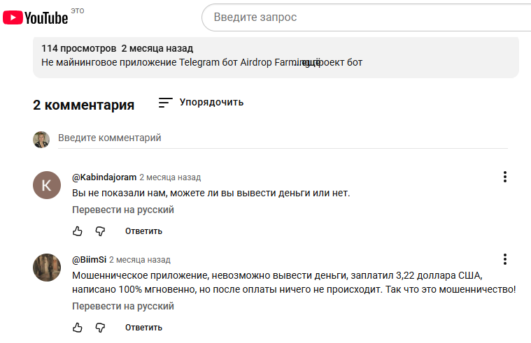 Единственный обнаруженный видео-отзыв на YouTube утверждает об исправных выплатах. Однако он не подкреплен какими-либо доказательствами. Например, скриншотами транзакций с кошелька или биржи. Комментарии же под ним опровергают информацию в ролике. В связи с этим есть серьезные основания полагать, что этот отзыв может быть заказным.