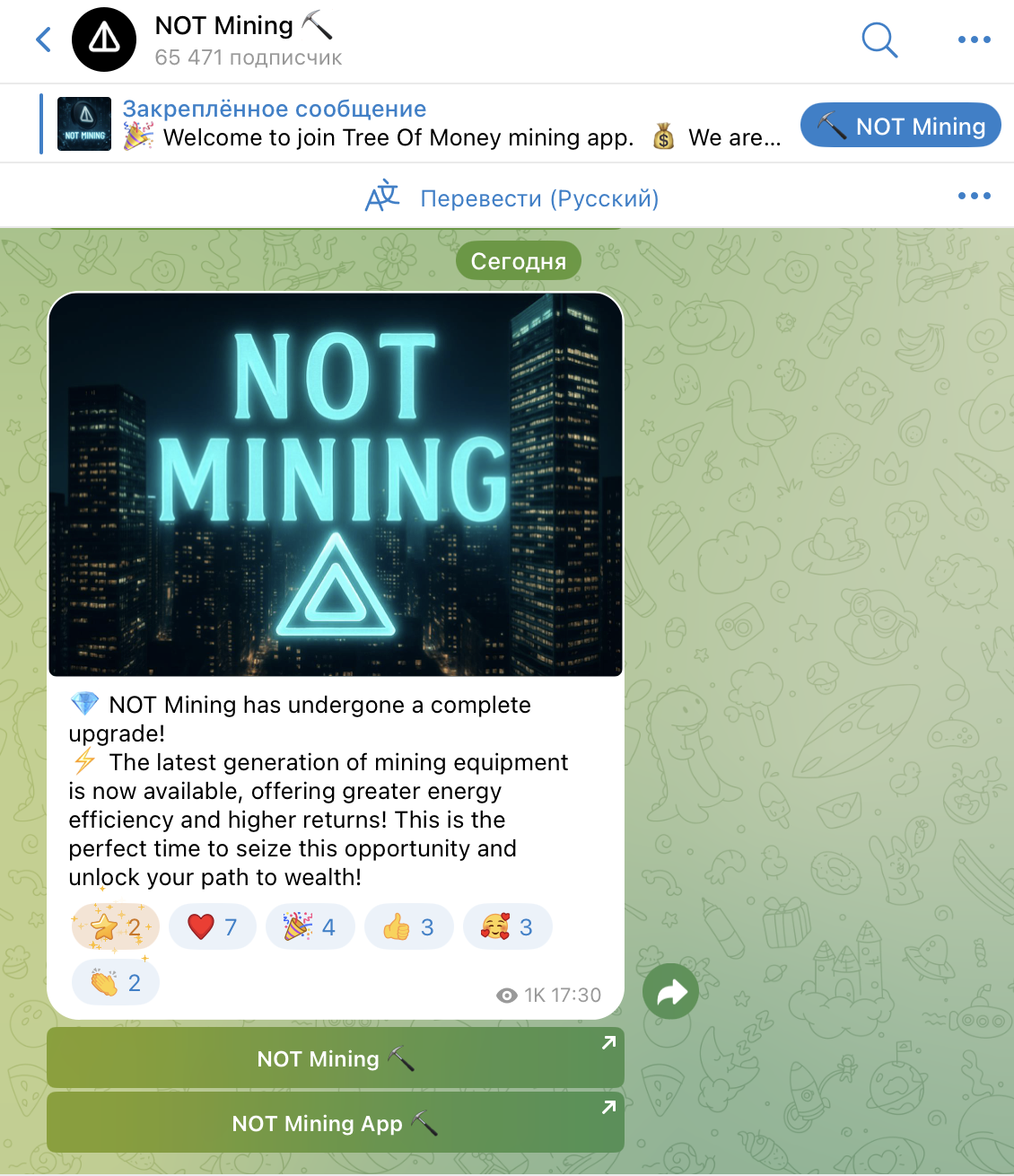 Также основатели объявили о запуске нового майнингового оборудования. Обещают, что оно энергоэффективнее и прибыльнее. Кроме того, заявили о наличии сертификации. Однако никаких документов или данных о регистрирующем органе не предоставили.Политика прозрачности проекта также вызывает вопросы. Например, комментирование в официальном канале «NOTMing Channel» закрыто для подписчиков. Фактически это ограничивает возможность открытого обсуждения и получения обратной связи. Между тем, на постах в канале разрешены реакции. Однако сообщается, что негативные смайлы администрацией заблокированы.