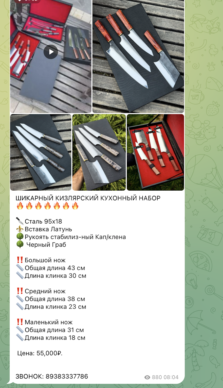 Цены чаще всего обсуждаются в личной переписке. В постах указаны ориентиры, но итоговая стоимость включает дополнительные опции, как гравировка, ручная доводка или другие декоративные элементы. Иногда встречается акцент на ограниченном наличии, что подталкивает клиента к быстрой оплате. Подобная механика работы известна в среде Телеграмма и используется для ускорения сделки.Оформление заказа
