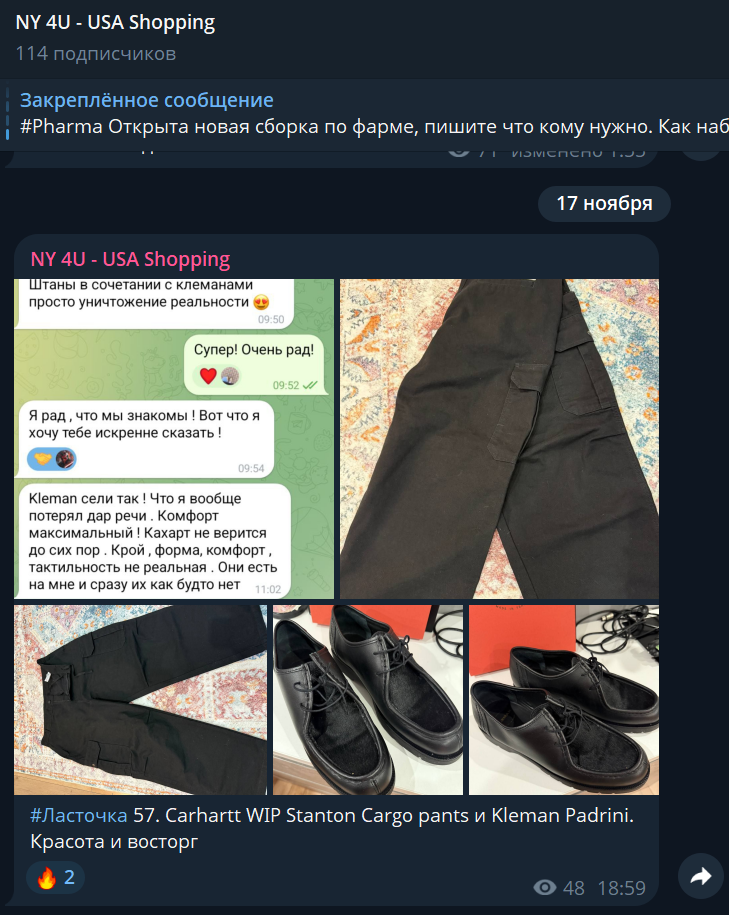 Посты на канале состоят из предложений с различными товарами, причем за день обычно выходит несколько публикаций, хотя последняя выложена 18.11.2025. О владельцах нет никакой информации, причем даже контакты для связи отсутствуют, так что вообще непонятно, как заказывать в магазине Ny 4u Usa Shopping. В первом посте есть ссылка на чат, но в декабре 2025 года мессенджер пишет, что она недействительна или устарела.