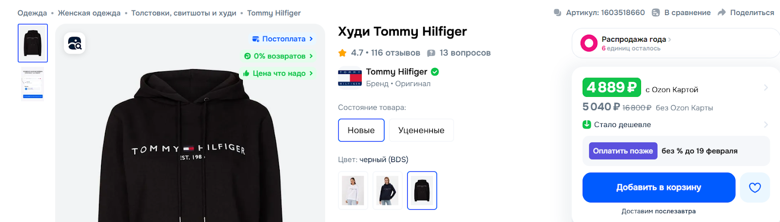 Непонятно, чем именно владельцы привлекали пользователей, так как все товары в сети можно найти гораздо дешевле, например, женское худи Tommy Hilfiger на маркетплейсе даже без карты Ozon стоит ₽5,040.