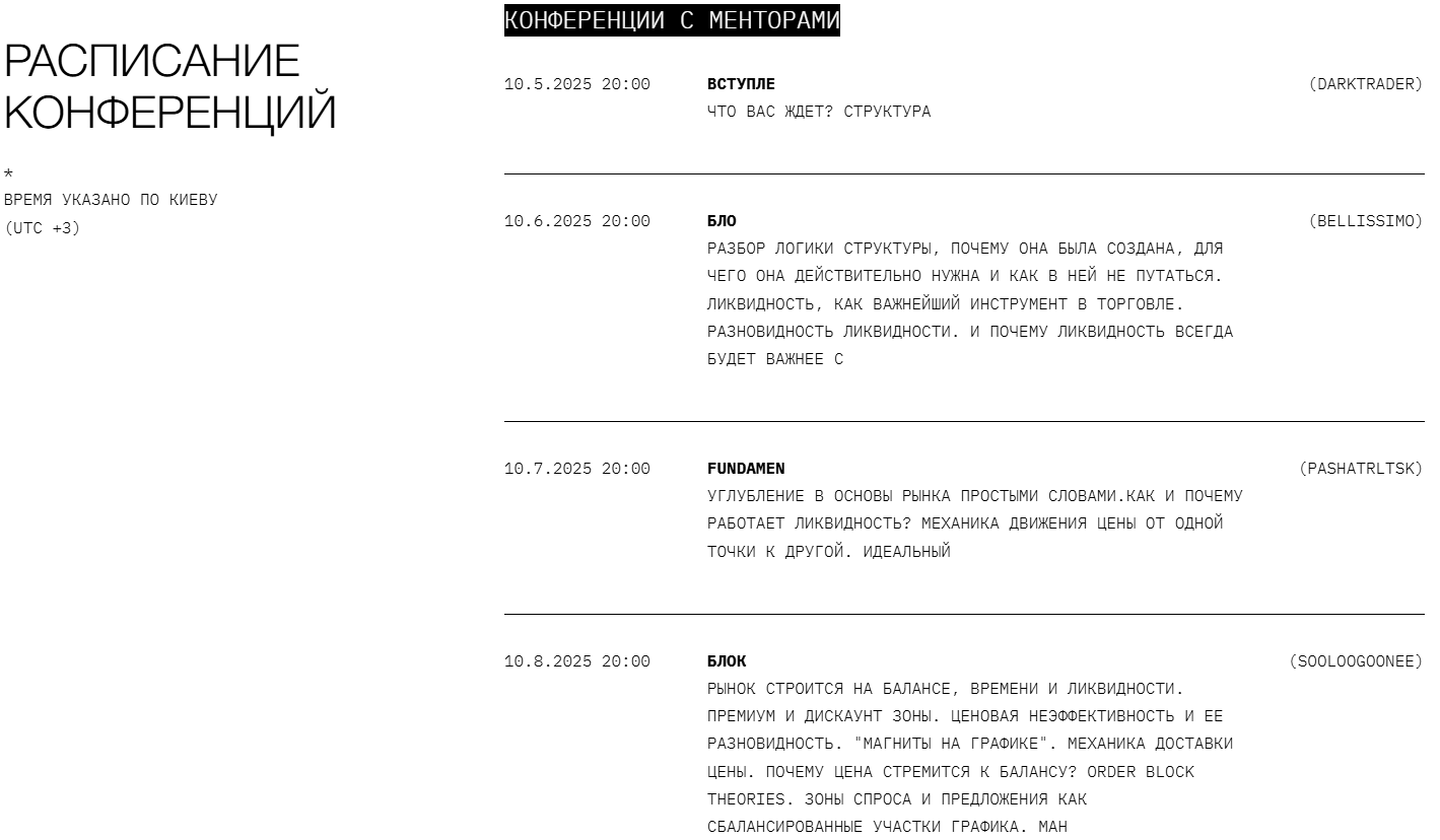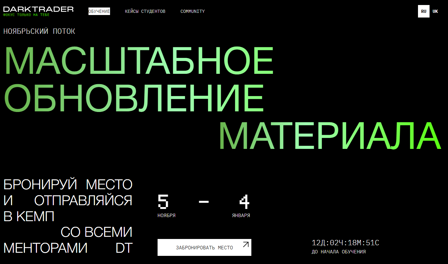 На площадке DarkTrader Co сведения об обучении оформлены в определенном стиле. Начало курса планируется на 5 ноября, а завершиться он должен в январе.
