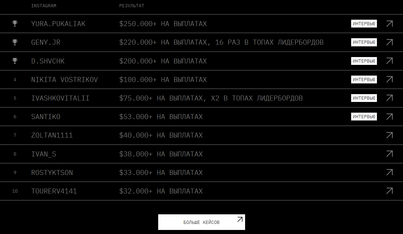 Кейсы наиболее успешных трейдеров, прошедших обучение Dark Trader, находятся в соответствующем разделе на площадке. Тут можем ознакомиться с суммами, которые они получили, а с некоторыми даже есть интервью. Выглядит все довольно убедительно, но быть уверенными в достоверности этих историй мы не можем.