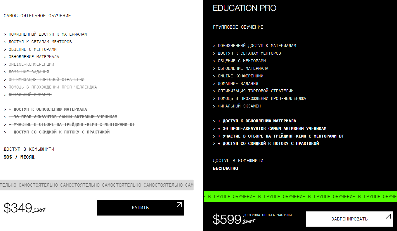 В зависимости от тарифа пользователю придется заплатить за курс Dark Trader Telegram $349, либо $599. Отличие более дорогого варианта в наличии расширенных материалов, приглашение в комьюнити, а также участие в отборе на трейдинг-кемп.