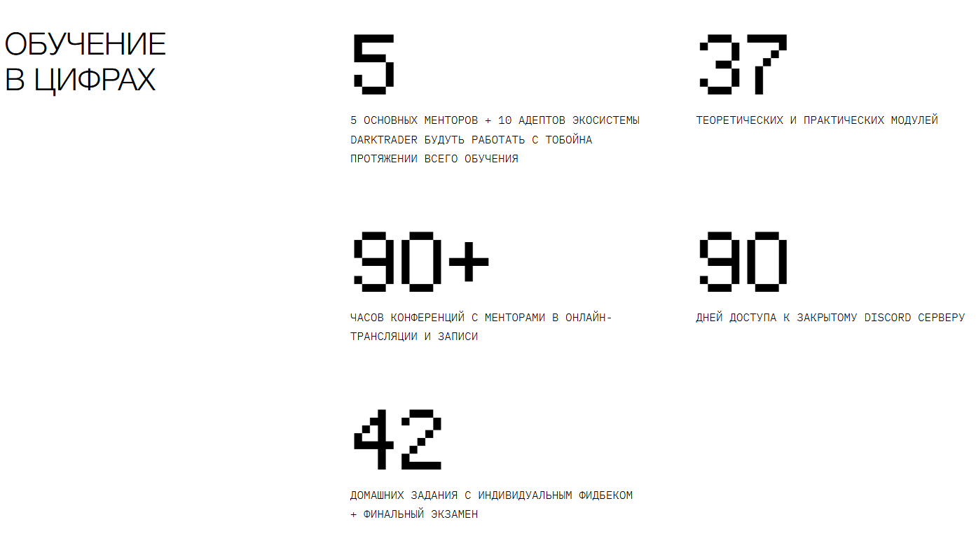 По заявлениям разработчиков, в курсе Дарк Трейдер нас ожидают 5 менторов, 37 модулей, 90+ конференций и 42 домашних задания.
