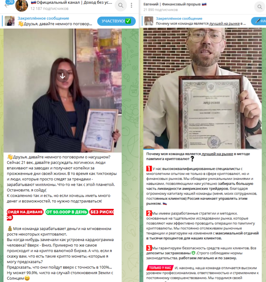 К публикации прикреплено видео девушки, где она в руках держит лицензию, которая позволяет ей легально работать. Точно такой же ролик, но с немного иным текстом находится на другом финансовом канале.Кроме заманивания на совместную работу автор ничего существенного не выкладывает. Иногда в телеграм-канале «Официальный канал Доход без усилий» она публикует отзывы от клиентов, которым якобы удалось получить свой высокий заработок.