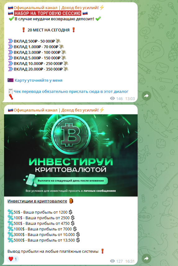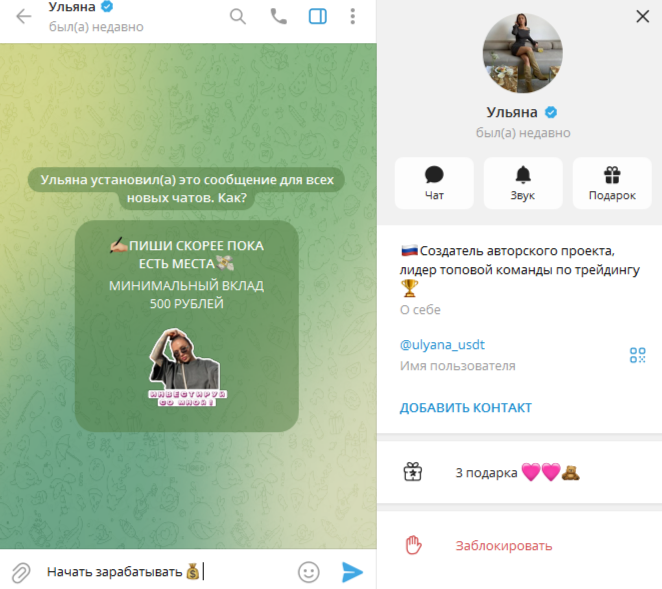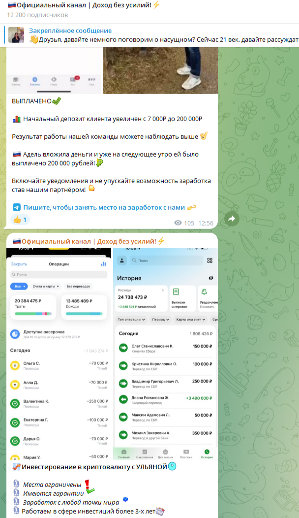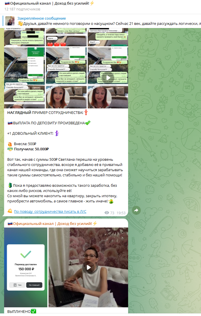 На своем канале она продолжает выкладывать переписки с довольными клиентами и скриншоты с крупными переводами денег, которые якобы заработали ее партнеры. Верить этим публикациям не стоит, так как это явно сделано на заказ.