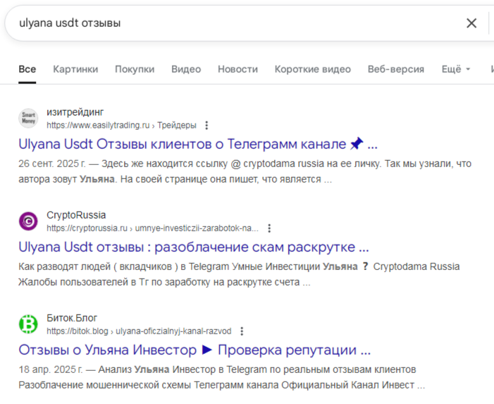 Ранее мы выяснили, что наполнение блога Ulyana Usdt является шаблонным. Все, кто его использовал, засветились в разоблачениях. Плюс, сама девушка обладает негативной репутацией вместе с другими своими блогами.