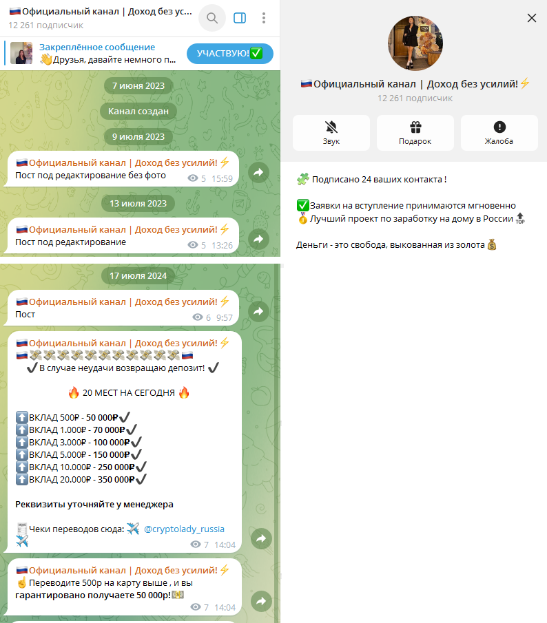 Телеграмм-канал «Официальный канал Доход без усилий» был создан в июне 2023 года, но вестись стал только с июля 2024 года. До этого целый год тут выходил контент на неизвестную тематику. Сейчас все эти публикации содержат только одну фразу «Пост для редактирования». В первой полноценной публикации автор стал сразу заманивать аудиторию сотрудничать вместе с ним.
