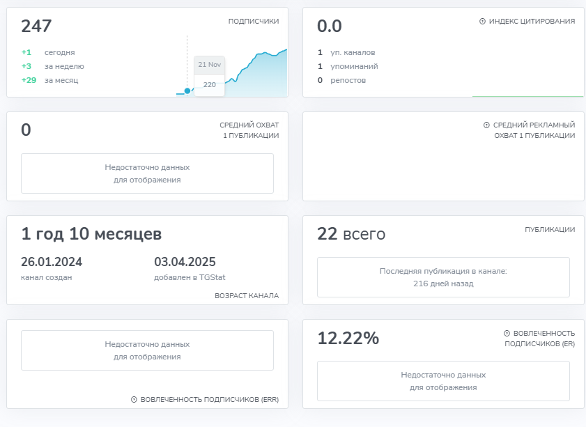 На канале в Телеграмм «Оил Ресурс» в основном выходят обзоры о перспективах развития нефтедобывающей отрасли в разных регионах, хотя посты не обновлялись с мая 2025 года, поэтому на TgStat недостаточно данных для отображения. Канал появился 26.01.2024, но на нем всего 250 подписчиков, а комментарии отключены.