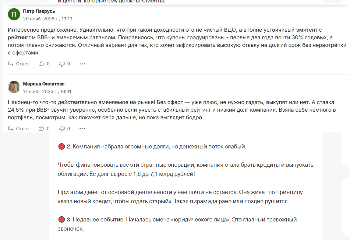 В сети мнения пользователей разделились, так как одни считают компанию перспективной, чтобы заработать на купонах, а другие пишут о высоких рисках из-за реорганизации, большой долговой нагрузки и проблемах с отчетностью. Стоит отметить, что большинство положительных комментариев написаны после даты выпуска облигаций, а негативные стали появляться после декабря 2025 года.