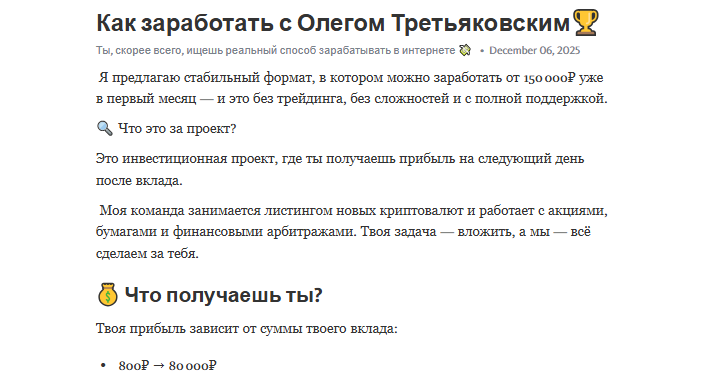 Также администратор ссылается на статью в Telegra “Как заработать с Олегом Третьяковским”. Она опубликована 6 декабря 2025 года, там автор заявляет о своем опыте более 5 лет, описывает условия сотрудничества и объясняет как зарабатывает такие большие суммы.