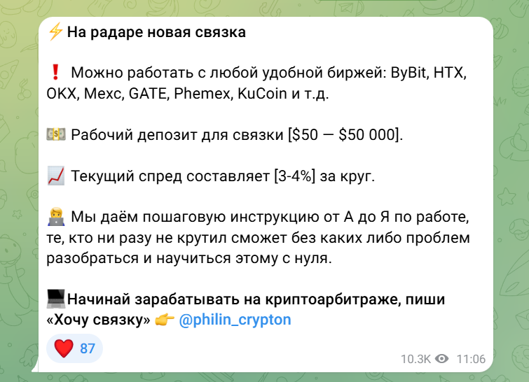 Уже в первой публикации герой обзора объявил о создании собственной P2P-команды по арбитражной торговле. При этом он сразу пообещал доходность на уровне 2-5%. В качестве плюсов автор отметил отсутствие лимитов и простоту сотрудничества.