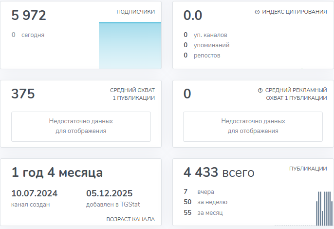 Канал появился 10 июля 2025 года. Подписчиков около 6 тысяч человек. Но посты читают в среднем 375 человек. Разница огромная – явная накрутка.