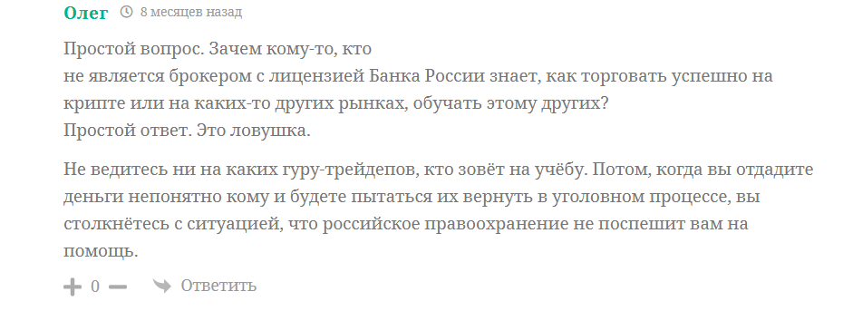 Про Pidec123 и его канал Pro Pocket Power отзывы в сети негативные, так как люди считают, что автор занимается разводом. Поскольку у создателя канала нет лицензий от ЦБ РФ, то участники, потеряв свою прибыль, могут оказаться в ситуации, когда вернуть деньги не получится. Трейдеру незачем обучать других торговать на рынке крипты, как думает комментатор и предполагает, что данный «гуру» трейдинга занимается мошенничеством.