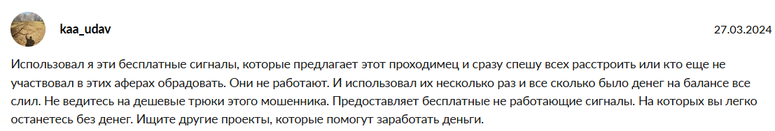 • Отзывы об авторе негативные и называют его проект настоящим скамом, обвиняют в том, что на сигналах можно лишь потерять деньги, следовательно, репутация проекта в сети оставляет негативное впечатление.